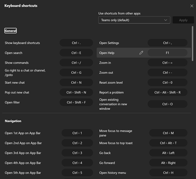 A screenshot of the keyboard shortcut option in Microsoft Teams.